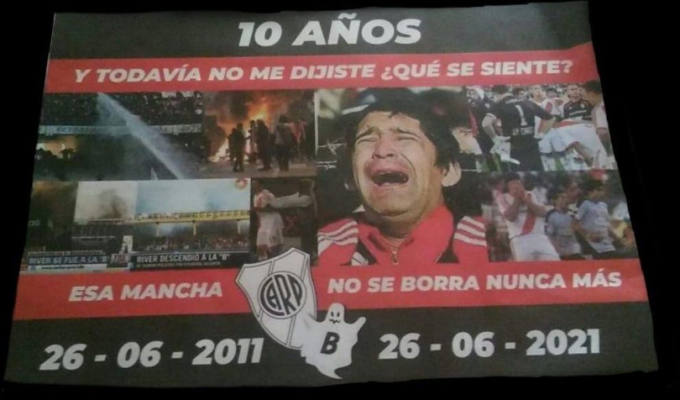 Algunos fanáticos de Boca hicieron un afiche especial, recordando el momento más doloroso para su eterno rival. "10 años y todavía no me dijiste ¿Qué se siente? Esa mancha no se borra nunca más", expresaron, junto a imágenes de aquella jornada ante Belgrano de Córdoba. La misma frase usaron en un pasacalle.