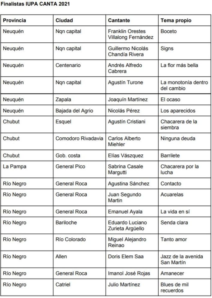 En su segunda edición, IUPA Canta recibió la postulación de 112 participantes de toda la Patagonia, y luego de una preselección quedaron elegidos 22, con representación de todas las provincias patagónicas. Para la final, se presentarán 16.