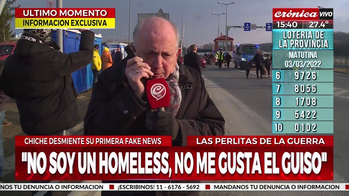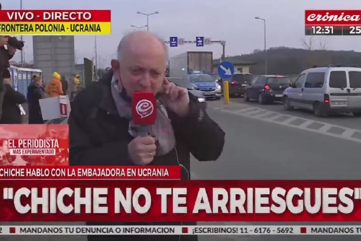 “Chiche en la guerra”, “Voy a entrar igual” y “Chiche no te arriesgues” decían las placas rojas que eligió el canal Crónica para resumir lo que le pasaba al conductor, quien intentaba hablar con las autoridades militares para que lo dejaran ingresar a Ucrania.