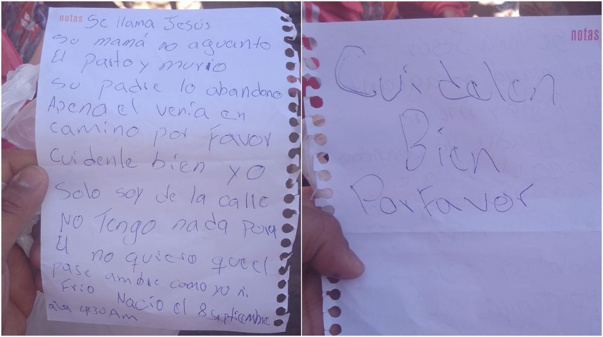 Cuando lo levantaron, en la misma bolsa en que lo habían envuelto había una carta. “Se llama Jesús. Su mamá no aguantó el parto y murió. Su padre lo abandonó apenas él venía en camino. Por favor, cuídenlo bien, yo solo soy de la calle y no tengo nada para él. No quiero que él pase hambre como yo ni frío. Nació el 8 de septiembre a las 04:30 am. Cuídenlo bien, por favor”, decía.