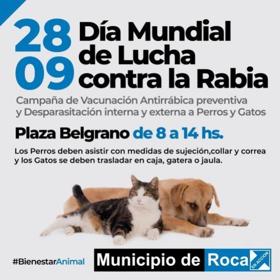 El Departamento de Bienestar Animal de la Municipalidad de General Roca realizará la campaña de desparasitación Interna y externa y vacunación antirrábica para perros/as y gatos/as.