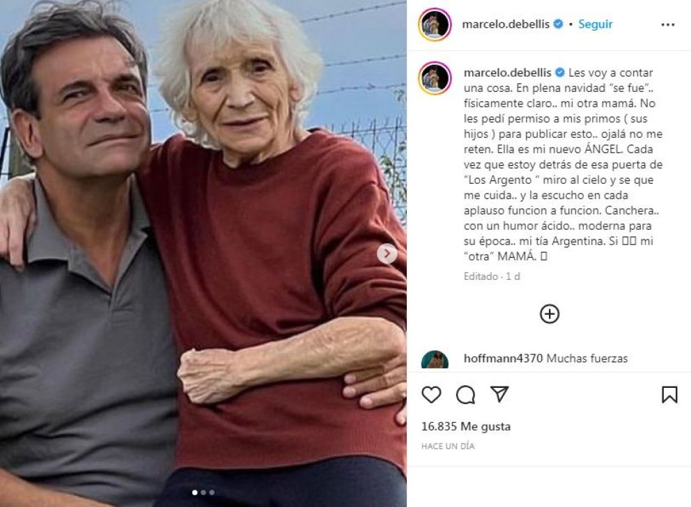 "Cada vez que estoy detrás de esa puerta de 'Los Argento' miro al cielo y se que me cuida.. y la escucho en cada aplauso función a función. Canchera.. con un humor ácido.. moderna para su época.. mi tía Argentina. Si mi 'otra' MAMÁ", cerró, muy angustiado aunque agradecido por el vínculo con aquella segunda madre tan querida.