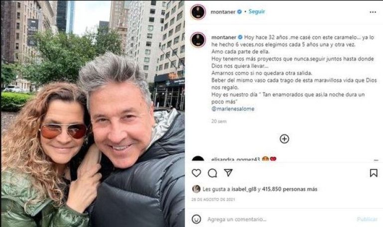 “Hoy nos volvimos a casar. Fue la sexta vez, me emocioné tanto o más que la primera, ¿por qué será? Me he tomado esta ceremonia con tanta seriedad, que me la pasé llorando. Me reconozco más enamorado que nunca y me propongo hacerla más feliz aún. Creo en el matrimonio y en el para siempre”, escribió el cantante en 2019 en su cuenta de Instagram.