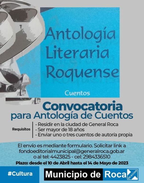 1. Desde el 10 de abril y hasta el 14 de mayo inclusive, se abre la convocatoria para participar de la Antología de Cuentos, del Fondo Editorial Municipal. Esta convocatoria es solamente para residentes de la ciudad de General Roca, con un mínimo de residencia de 2 años (condición excluyente), mayores de 18 años y sin límite de edad.