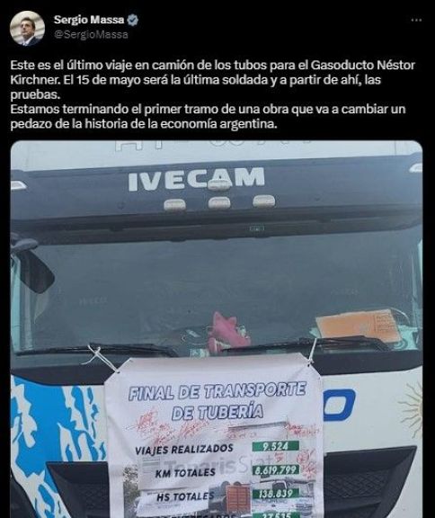 “Este es el último viaje en camión de los tubos para el Gasoducto Néstor Kirchner. El 15 de mayo será la última soldada y a partir de ahí, las pruebas”, comenzó relatando el político desde su cuenta de Twitter.
