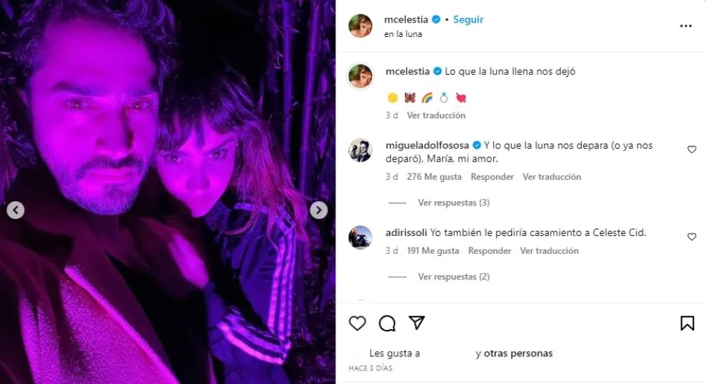 Ante lo que fue la confirmación del pedido de matrimonio, ella dejó entrever que sobran las palabras para un momento así y sólo atinó a escribir: “Lo que la luna llena nos dejó”. Además acompañó esta frase con emojis de la luna, una mariposa, un arcoiris, un anillo y un corazón flechado.