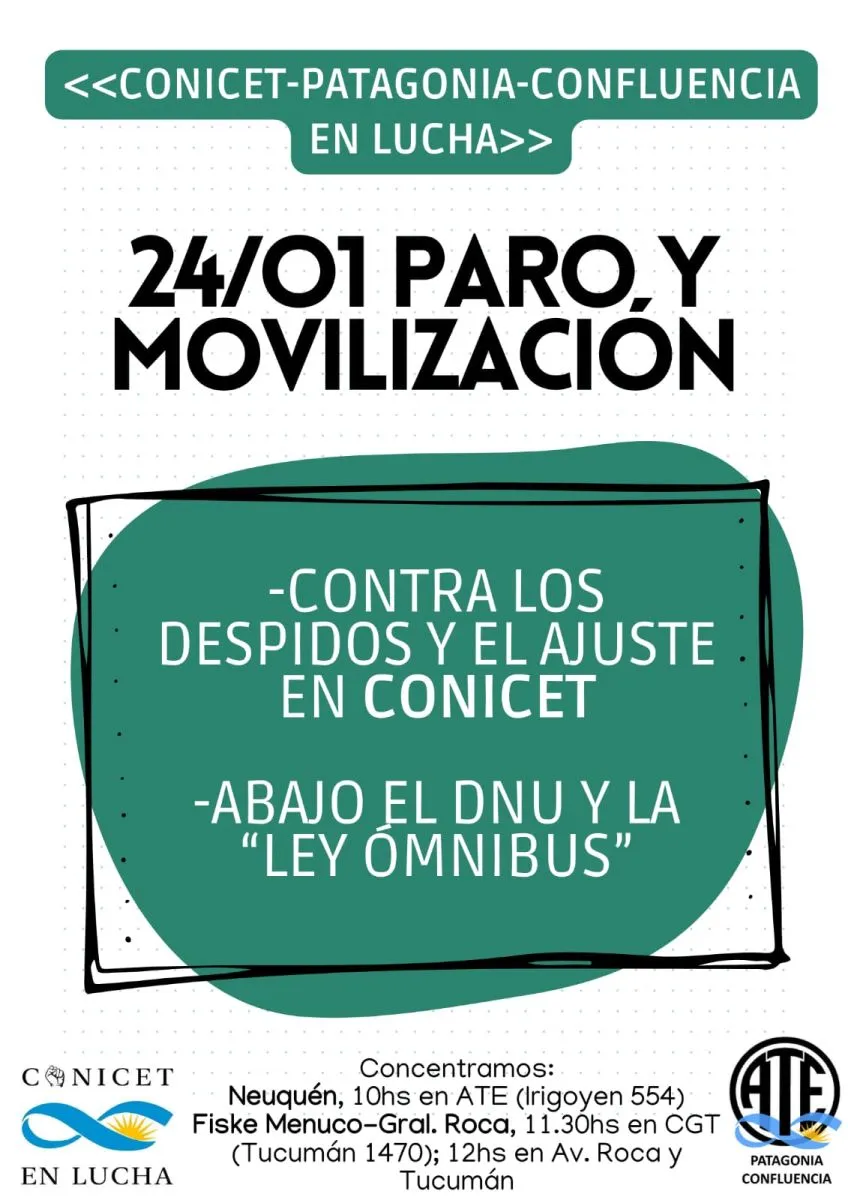 Las y los trabajadores del Centro Científico Tecnológico (CCT) Patagonia Confluencia informaron en un comunicado que adhieren al paro y movilización de este miércoles 24 de enero, "en rechazo a los despidos en CONICET, contra el ajuste que el actual gobierno pretende llevar adelante sobre nuestro organismo, en contra del DNU y la ley ómnibus".