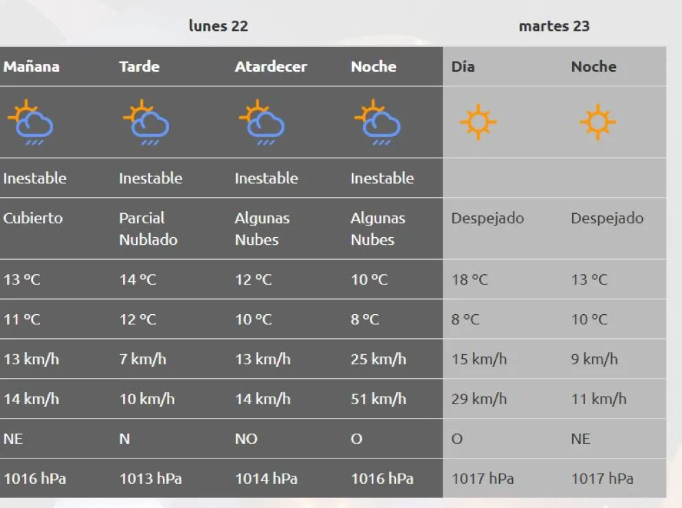 DURANTE EL LUNES INESTABLE CON PROBABLES LLUVIAS EN VALLES MESETA COSTA Y CORDILLERA. MEJORA EL MARTES. EL MIÉRCOLES INGRESA UN SISTEMA FRONTAL CON LLUVIAS Y NEVADAS EN CORDILLERA QUE SE MANTIENE EN LA SEMANA. INESTABLE CON VIENTOS EN TODA LA REGIÓN.