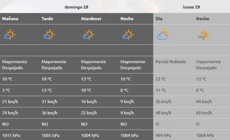 Continúan las tardes templadas y mañanas frías, hacia la tarde periodos de vientos moderados. Para cordillera, continúa el ingreso de un sistema frontal, precipitaciones moderadas con nevadas. Periodos de vientos moderados con viento blanco. Mejoran las condiciones el día miércoles 1 de mayo.