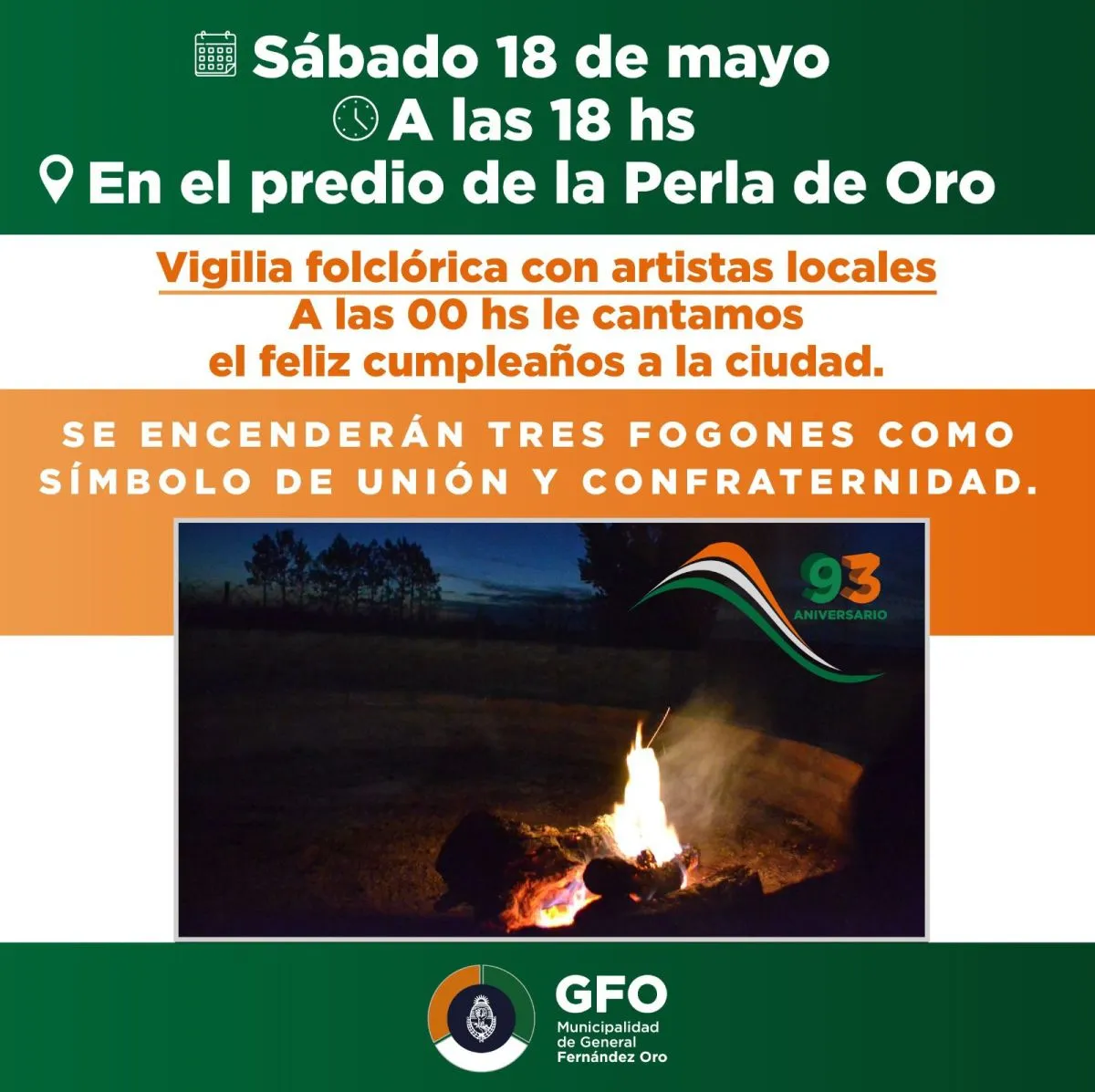 El sábado 18, en el predio de La Perla de Oro, desde las 18, se dará inicio a la vigilia folclórica con la presencia de artistas locales. Habrá tres fogones, como símbolo de unión y confraternidad, y justo a la medianoche se invitará a los presentes a cantar el feliz cumpleaños a la ciudad.