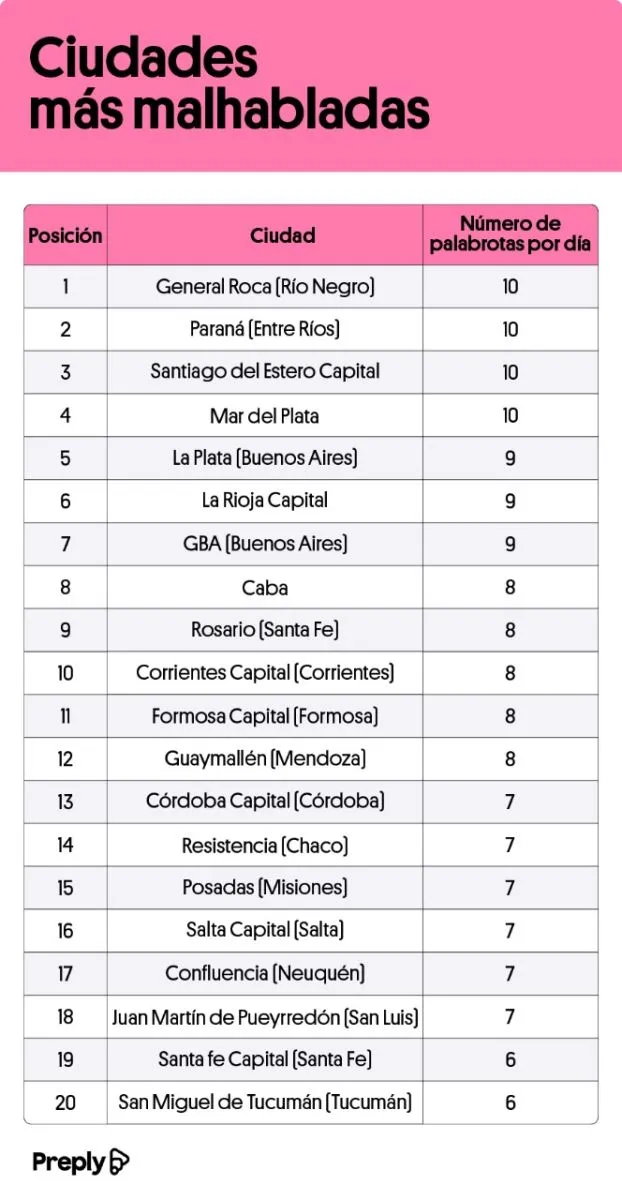 El estudio revela que el argentino promedio pronuncia un poco más de 8 insultos al día, variando según la región. Ciudades como General Roca, Paraná, Santiago del Estero Capital, Mar del Plata, La Plata, Ciudad de La Rioja y Gran Buenos Aires encabezan la lista con un promedio de entre 9 y 10 malas palabras al día.