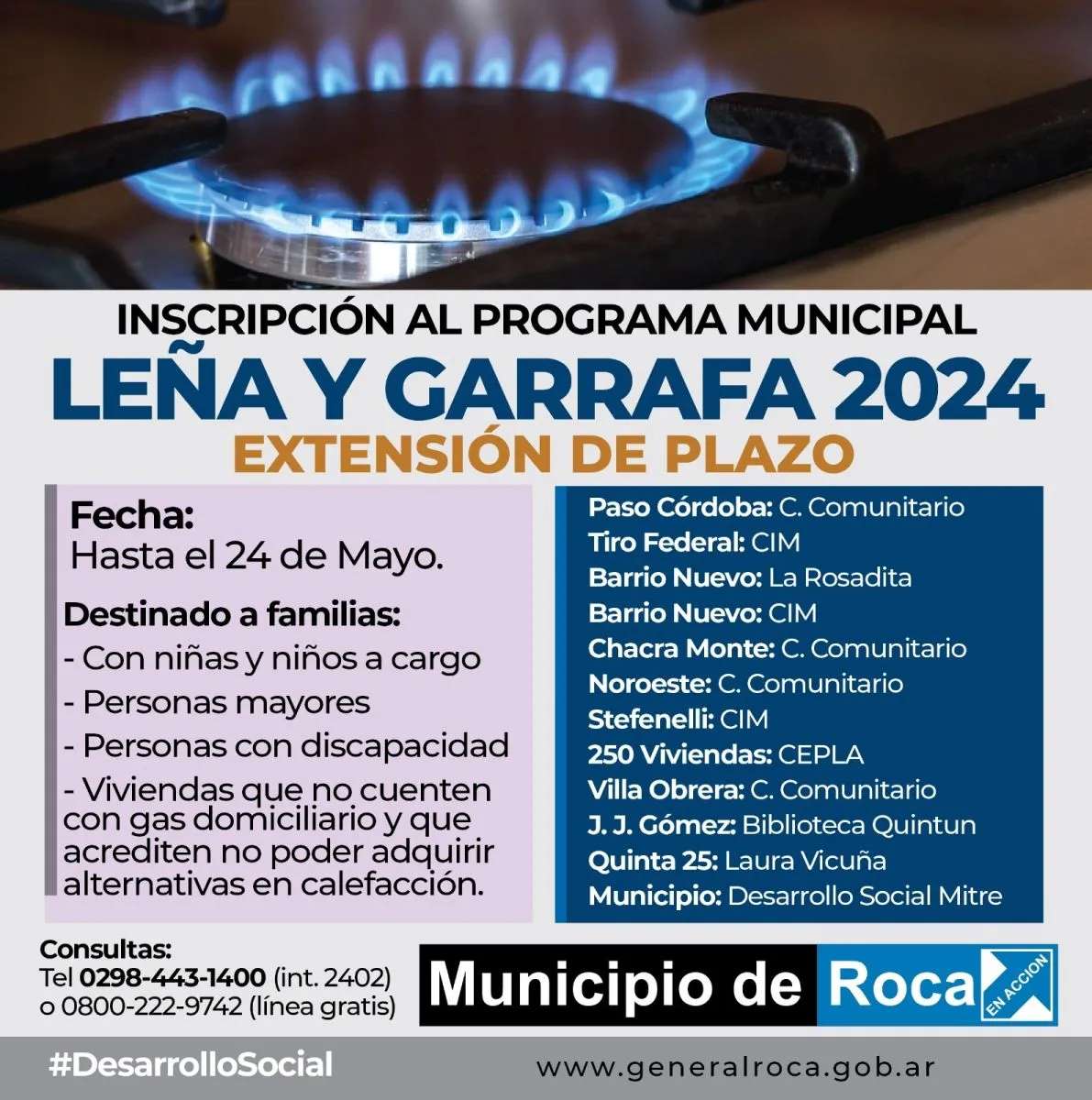 Este Programa Municipal tiene como fin acompañar a aquellas familias que aún no cuentan con el servicio de gas en la vivienda y está dirigido únicamente a familias: con niñas y niños a cargo de su cuidado personal, personas mayores y/o personas con discapacidad y que, por su situación económica, acrediten la necesidad de la asistencia.