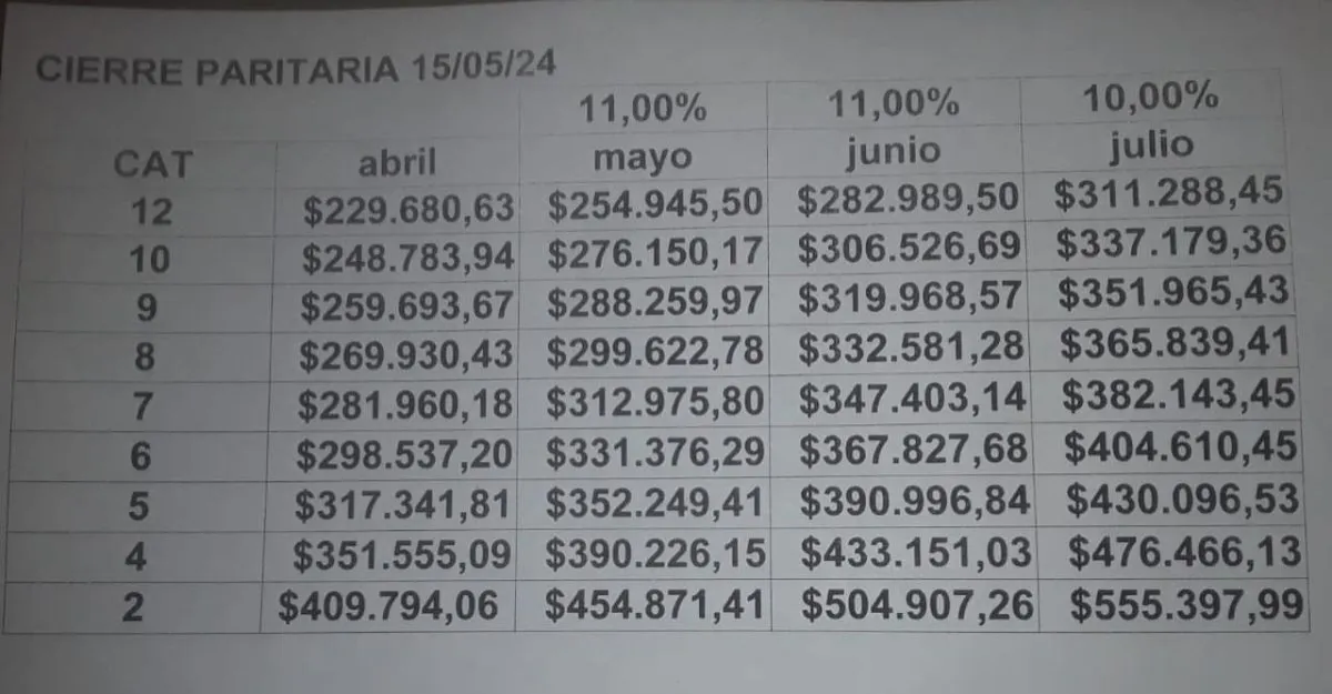 El sueldo de mayo, a cobrarse en junio con el 11% de aumento, indica que para la categoría 2, el pago será de $454.871,41.