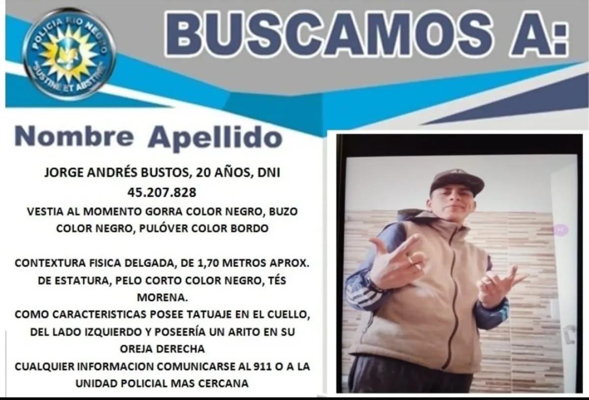 La Policía de Río Negro hizo pública la búsqueda de Jorge Andrés Bustos, un joven de 20 años que se ausentó de su domicilio el sábado 18 de mayo.