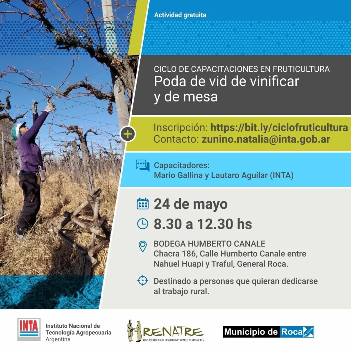 Desde INTA General Roca, el Municipio de General Roca y RENATRE, se informa a toda la comunidad que se encuentran abiertas las inscripciones para el módulo sobre "Poda de vid de vinificar y de mesa", correspondiente al Ciclo de Capacitaciones en Fruticultura.