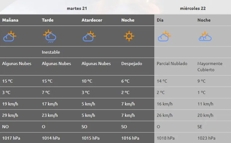 Lluvias y nevadas moderadas para las zonas cordilleras de Cuyo, Neuquén, Rio Negro y Chubut. Mejoran las condiciones a partir del día miércoles. Para los valles, meseta y costa, cielo mayormente cubierto con lloviznas. Para los próximos días tiempo bueno. Leve descenso de la temperatura con mañanas frías.