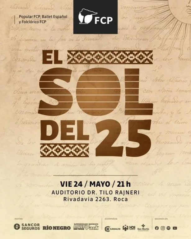 La Fundación Cultural Patagonia (FCP) se complace en presentar su nueva producción titulada "El sol del 25", una propuesta que reunirá a destacados artistas de la escena nacional en el Auditorio Dr. Tilo Rajneri de Roca el próximo viernes 24 de mayo a las 21.