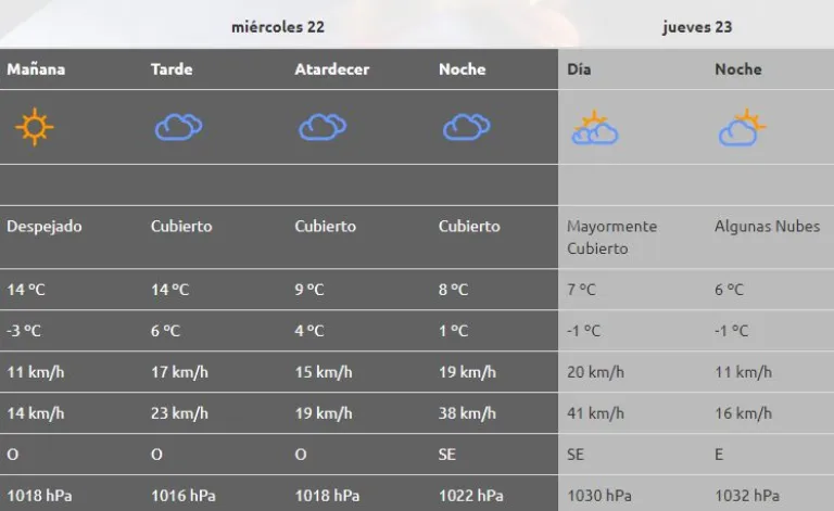 Para los próximos días tiempo bueno con descenso de la temperatura, probabilidad de heladas. Para la zona de los lagos lluvias y nevadas débiles, mejoran las condiciones el día de mañana. En el norte de la provincia del Neuquén tiempo bueno con nubosidad variable.