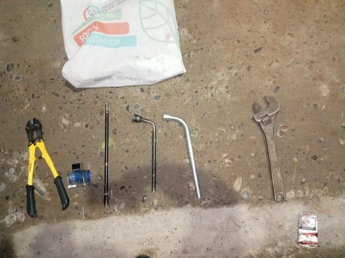En el interior del vehículo se encontró una rueda de auxilio con dos tijeras de corte, una llave francesa, un perfume y un equipo de comunicaciones utilizado como inhibidor. Sin embargo, la damnificada confirmó que la rueda no correspondía a la sustraída de su vehículo.