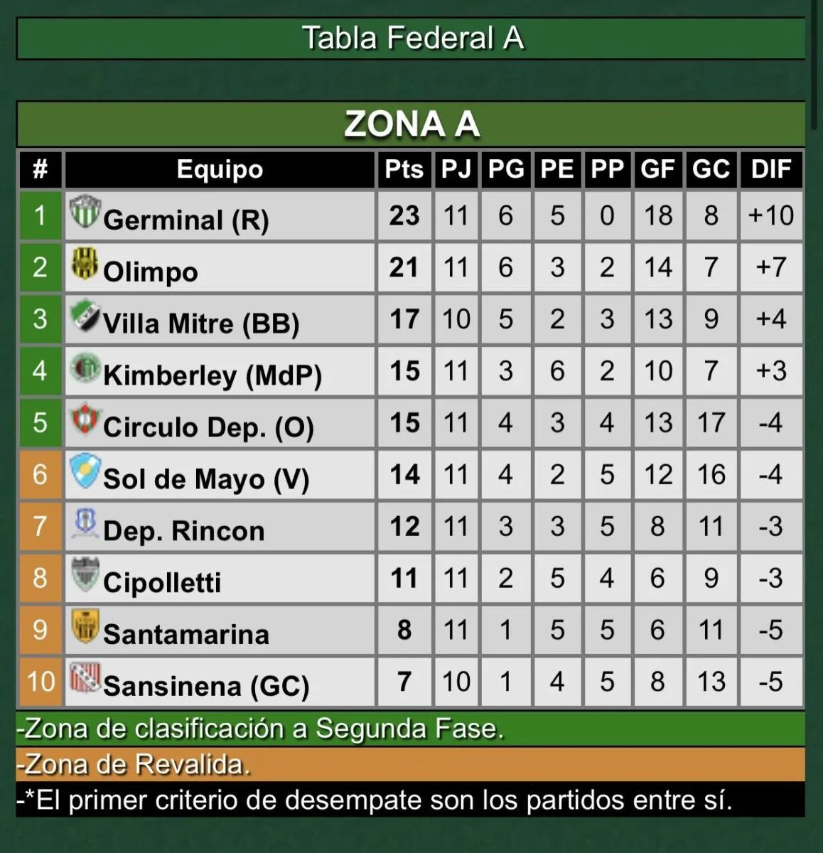 Este domingo además Kimberley superó 2 a 0 a Deportivo Rincón, mientras que Sol de Mayo se impuso por 3-0 ante Círculo Deportivo Germinal superó 2 a 0 Santamarina, logrando así ser el único líder de la tabla. Sansinena y Villa Mitre se enfrentarán mañana, a las 15.30, en cancha de Bella Vista donde los de Cerri harán de local.