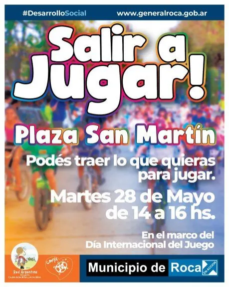 Hoy martes 28 de mayo, la ciudad de Roca será el escenario de un imperdible encuentro de juegos y diversión. Organizado por el Municipio de General Roca, en conjunto con el CONyA y la Red Argentina de Ciudades de Niñas y Niños, este “Salir a jugar” promete ser un evento lleno de entretenimiento para los más pequeños.