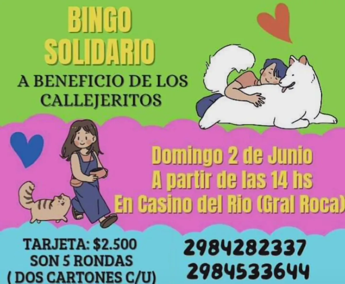Frente a esto, muchas veces realizan recaudaciones para poder costear los gastos del veterinario, alimento, entre otros. Por lo que han decidido realizar un bingo solidario a beneficio de los callejeritos. El evento se realizará el 2 de junio a partir de las 14:00 horas en el Casino del Río. La tarjeta tiene un valor de $2500, son cinco rondas con 2 cartones cada una. Pueden solicitar los cartones al 2984282337 o al 2984533644