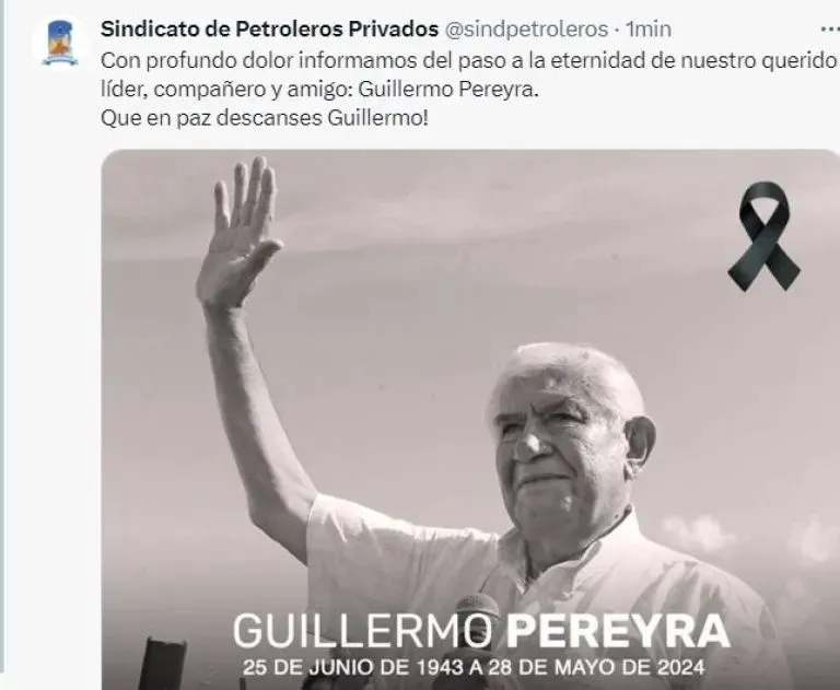Agregaron: “Guillermo Pereyra, nos deja un gran legado de lucha inquebrantable en la defensa de los trabajadores petroleros. Su visión, liderazgo y compromiso serán un faro para las generaciones venideras de esta institución. Acompañamos a su familia en este momento de profundo dolor”.