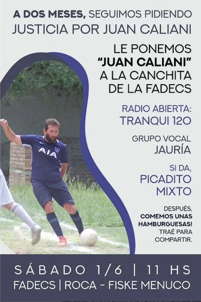 A dos meses de su fallecimiento, la familia de Juan Caliani, periodista y estudiante de la Facultad de Derechos y Ciencias Sociales (FaDeCS) de la Universidad Nacional del Comahue, invita a la comunidad a participar del acto en el que la canchita de la facultad se renombrará en su honor.