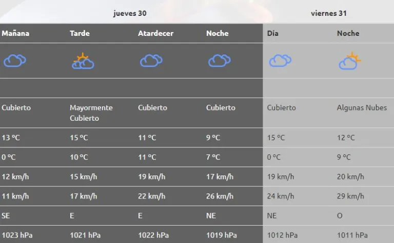 Jueves, rotación de vientos al sur y sudeste, lo que provoca el ingreso de aire húmedo y frío desde el Atlántico sur, períodos nubosos, leve descenso de la temperatura. Frío el fin de semana, heladas.
