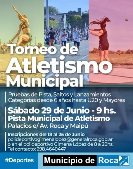 El Municipio de Roca, a través de la Dirección de Deportes, anuncia con entusiasmo la realización de un emocionante Torneo de Atletismo que se llevará a cabo el próximo sábado 29 de junio en la Pista Municipal de Atletismo. Este evento, que dará inicio a las 9 y se extenderá a lo largo de la jornada, promete ser una jornada deportiva llena de emoción y competitividad.