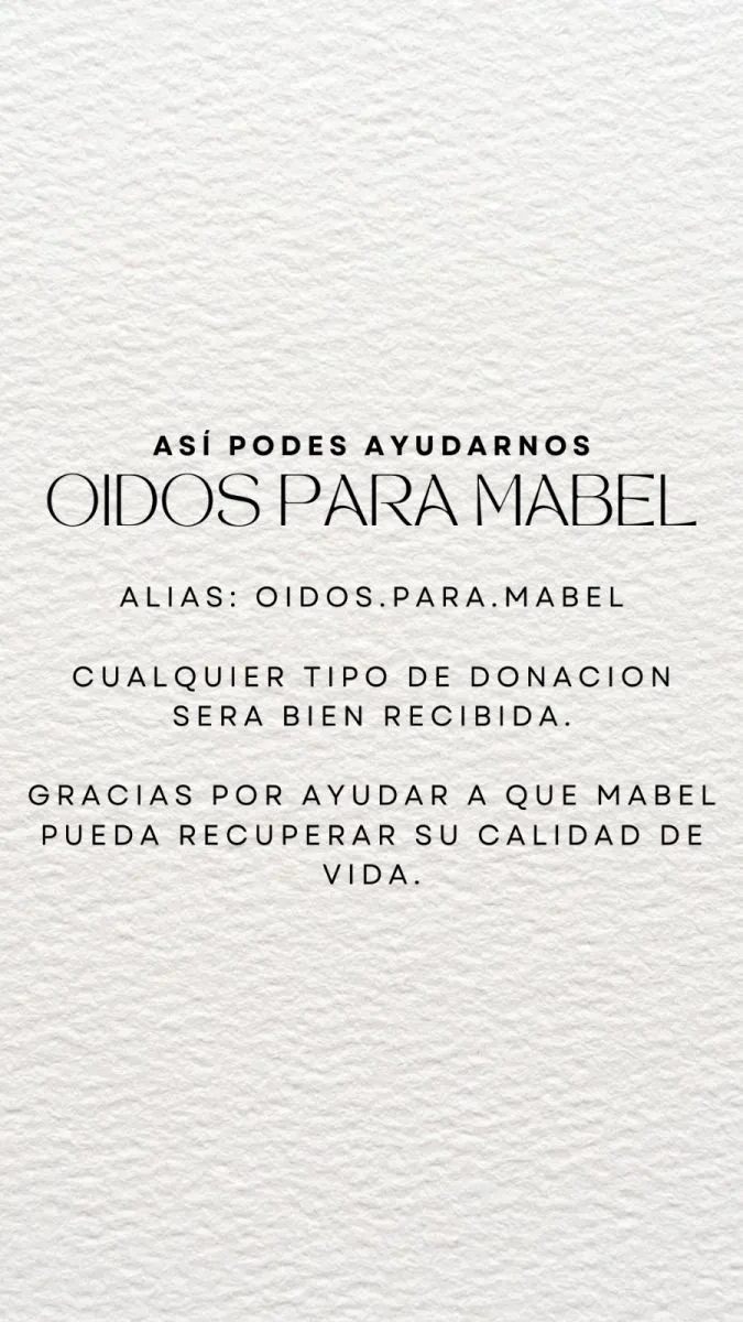 El alias en el que las personas puede colaborar es: “OIDOS.PARA.MABEL”, toda donación es bienvenida y será de gran ayuda. Así también, quienes no puedan colaborar económicamente, pueden hacerlo compartiendo el caso en las redes para que llegue a más personas. “Las personas pueden ayudar muchísimo con el solo hecho de compartir la causa para que llegue a más personas y se pueden comunicar conmigo atreves de la cuenta de Instagram @oidosparamabel o a traves de tiktok "oidosparamabel”, añadió Abril.