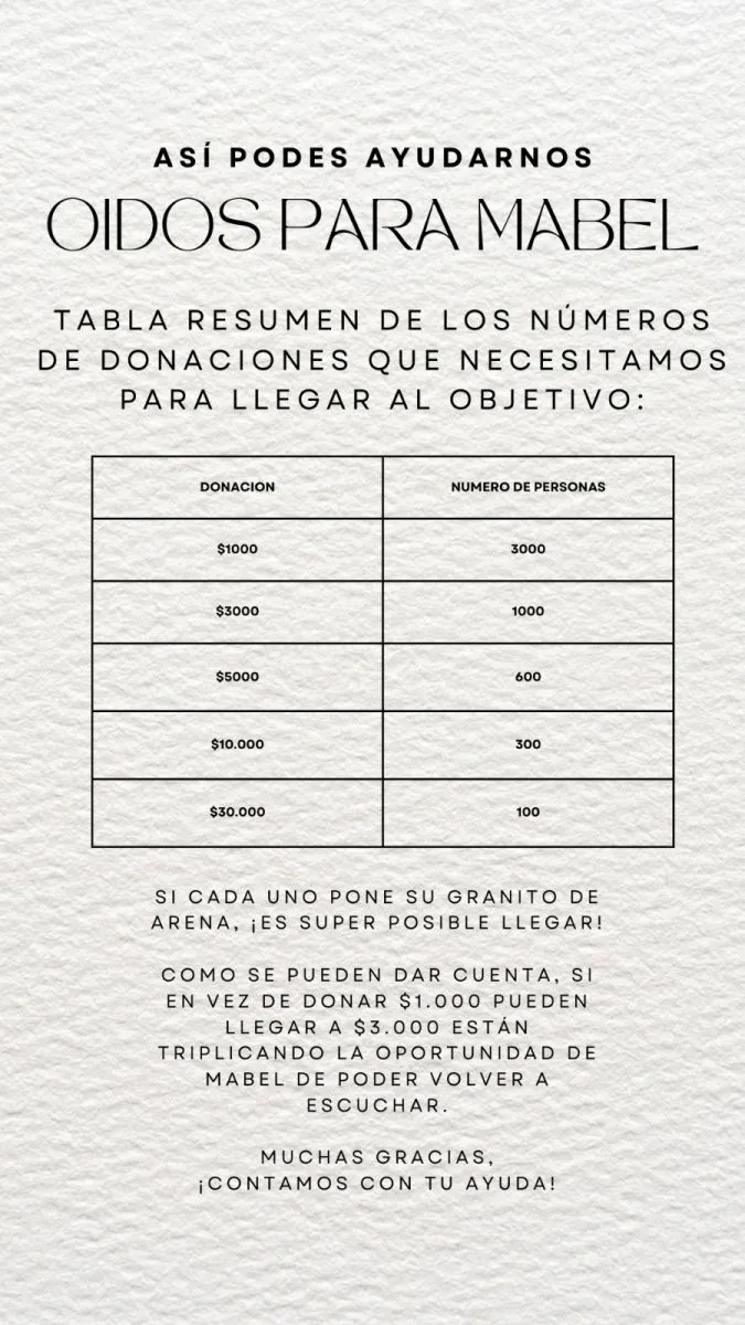 Así nace “Oídos para Mabel”, una iniciativa que “Surge de la necesidad de que mi mama pueda recuperar su audición para poder mejorar su calidad de vida, ya que una vez con tratamiento ella va a poder recuperar no solo su audición, sino que va a poder vivir de nuevo”, aseguró Abril. El fin de la colecta es poder recaudar $3.336.840 millones de pesos argentinos, que es lo que vale el tratamiento en total y tienen tiempo hasta el 24 de julio para poder recaudar al menos la mitad del presupuesto.