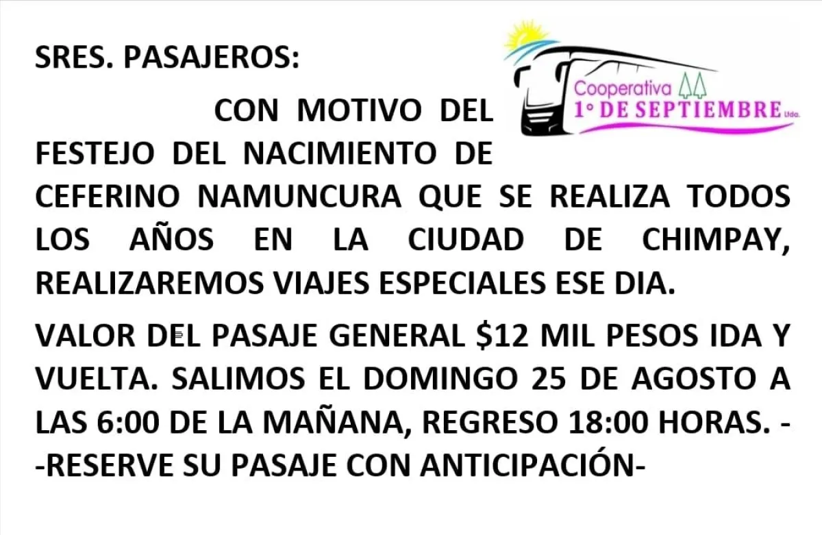 A dos semanas de la 54° Peregrinación de Ceferino Namuncurá a Chimpay, la Cooperativa 1° de Septiembre ya puso a la venta los pasajes para el domingo 25 de agosto.