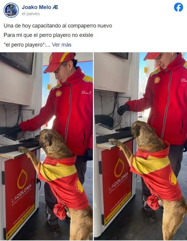 La foto, tomada en una estación de servicio de Shell en Ruta Chica y Circunvalación, muestra al futbolista, en su rol de playero, acompañado de un tierno perrito abrigado con los colores de la firma petrolera.