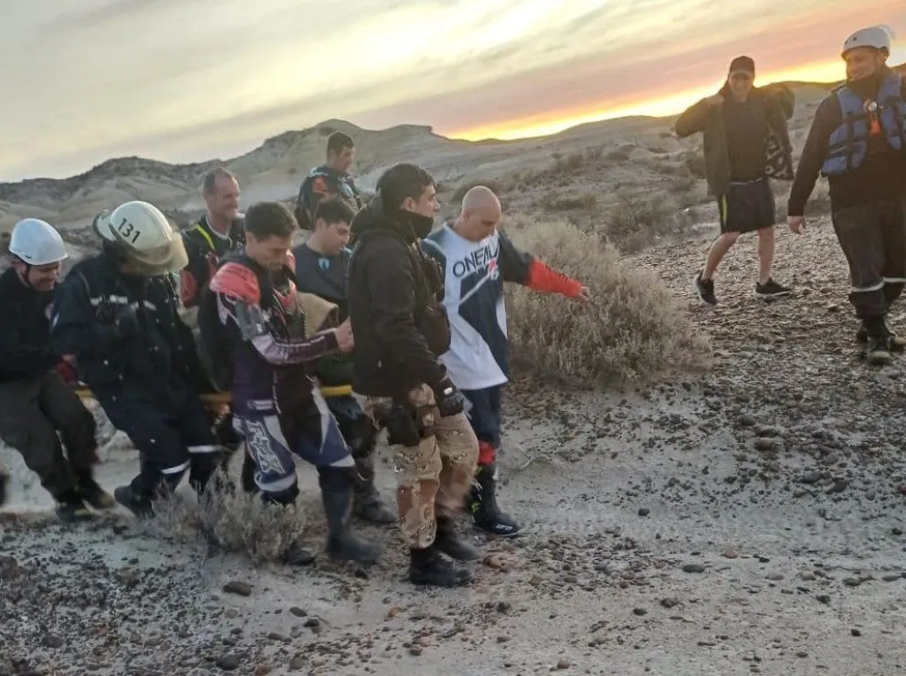 Debido a la crecida del río, el acceso a la zona donde se encuentra el motociclista es imposible, por lo que, un lugareño aportó su lancha para poder ubicar a la persona lesionada. Se trata de un motociclista de 42 años oriundo de roca, que cayó de su moto, cuando practicaba motocross en el Valle de la Luna Amarillo. Debido a la fuerte caída, se encuentra imposibilitado de moverse y con lesiones varias.