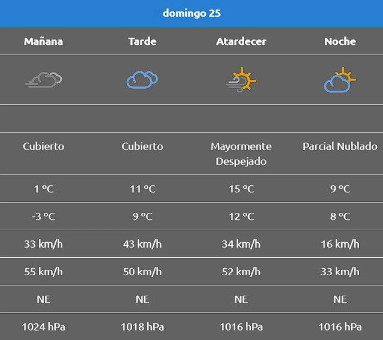 El cielo estará mayormente soleado, y aunque el viento será leve con velocidades que podrían variar entre 10 y 30 km/h provenientes del sector oeste, no se esperan lluvias durante el día.