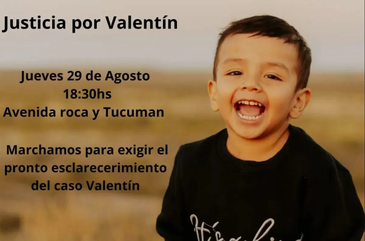A un mes de la muerte del pequeño Valentín Mercado, en una institución médica de Roca, su familia convocó a una nueva movilización para hoy, jueves 29 de agosto, a las 18:30. Indicaron que se reunirán en avenida Roca y Tucumán para marchar, exigiendo el pronto esclarecimiento del caso.