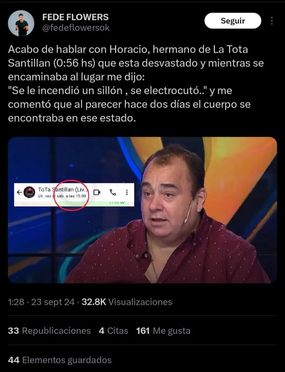 Fede Flowers, periodista especializado en espectáculos, dio a conocer una conversación mantenida con Horacio, hermano de Santillán, quien se mostró devastado por la pérdida. Horacio reveló: “Se le incendió un sillón y se electrocutó”. Trágicamente, el cuerpo de La Tota fue encontrado en ese estado en su hogar en Ituzaingó, provincia de Buenos Aires.