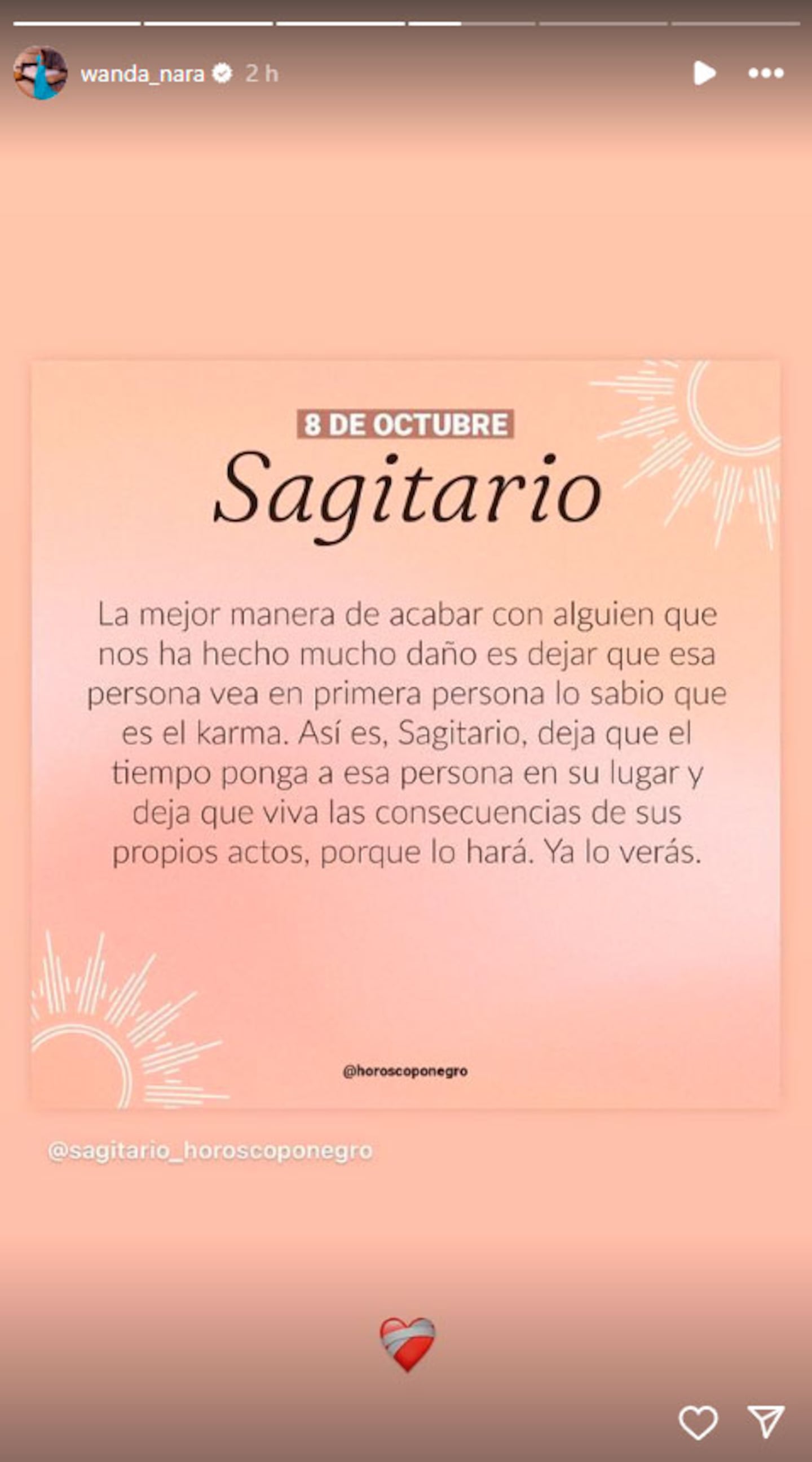 Más allá del malestar que la acompaña en estos momentos, Wanda no ha dudado en apoyarse en algo más sutil pero igualmente poderoso: el karma. La empresaria difundió una publicación astrológica apuntando a Sagitario, su signo zodiacal. Este mensaje, aunque sutil e indirecto, ofreció una perspectiva astrológica de cómo debería enfrentarse a sus opositores, enfatizando en que el pasar del tiempo se ocupará inevitablemente de poner las cosas en su lugar.