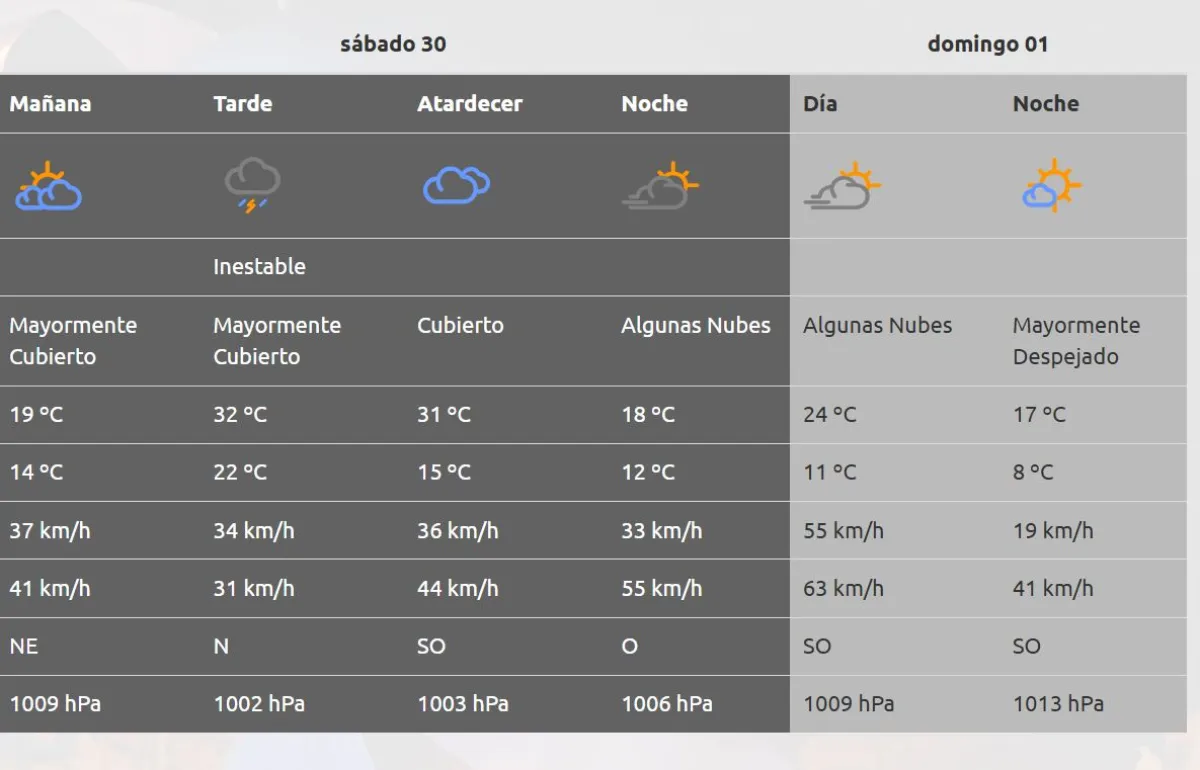 Para el domingo se espera nuevamente un descenso de la temperatura, con periodos de vientos regulares con ráfagas que llegarán a los 63 km/h.