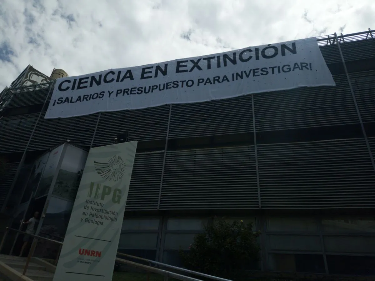 En la última semana, trabajadores del Instituto de Investigación en Paleobiología y Geología (IIPG), del Instituto Patagónico de Estudios en Humanidades y Ciencias Sociales (IPEHCS) y del Centro de Investigación y Transferencia (CIT), han decidido visibilizar a través de una bandera la crítica situación que está atravesando el sector a nivel país.