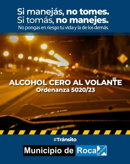 La Dirección de Transito del Municipio recuerda que está vigente la Ordenanza 5020/23 mediante la cual se prohíbe conducir cualquier tipo de vehículo con una alcoholemia superior a cero (0) miligramos por litro de sangre.