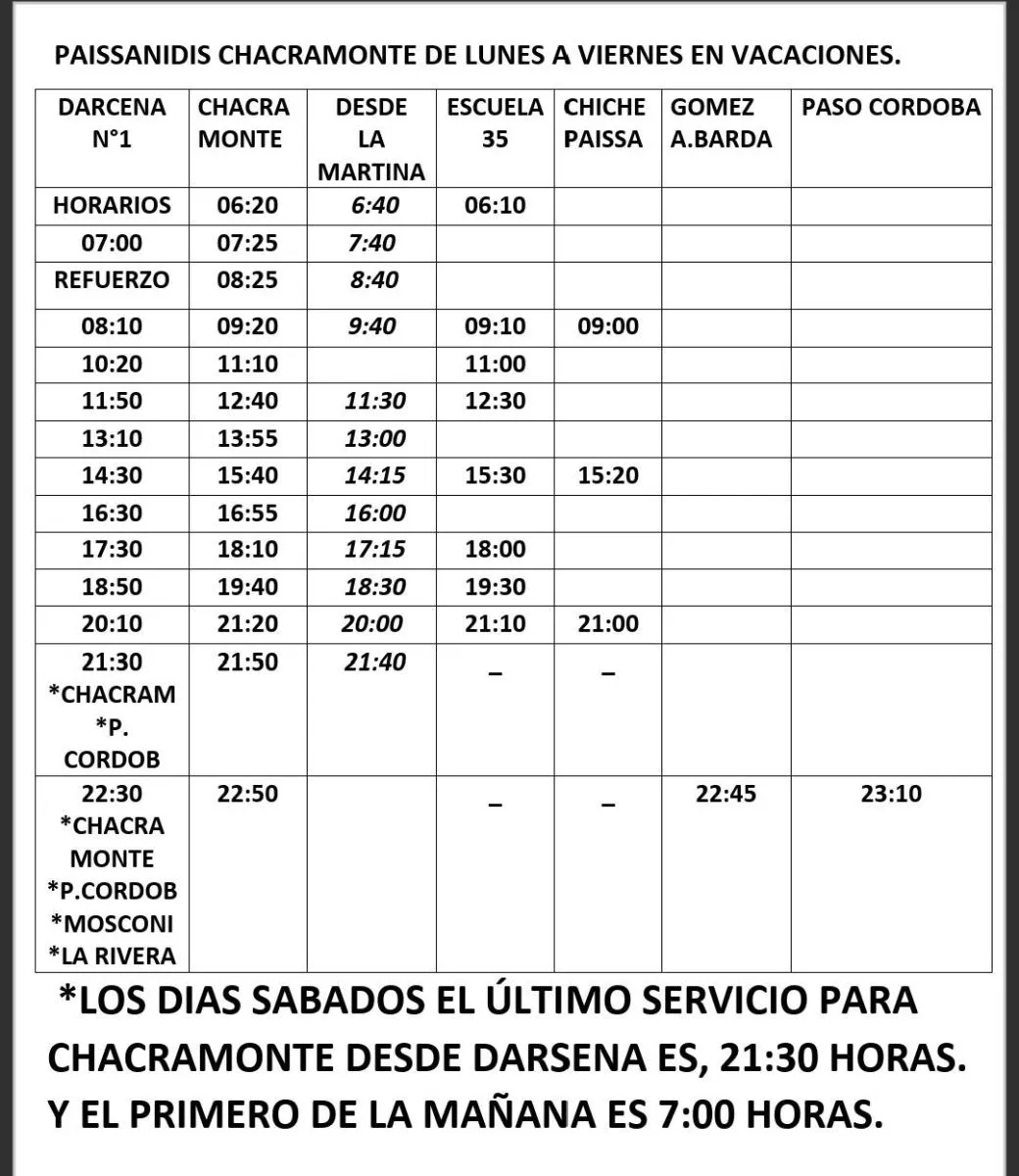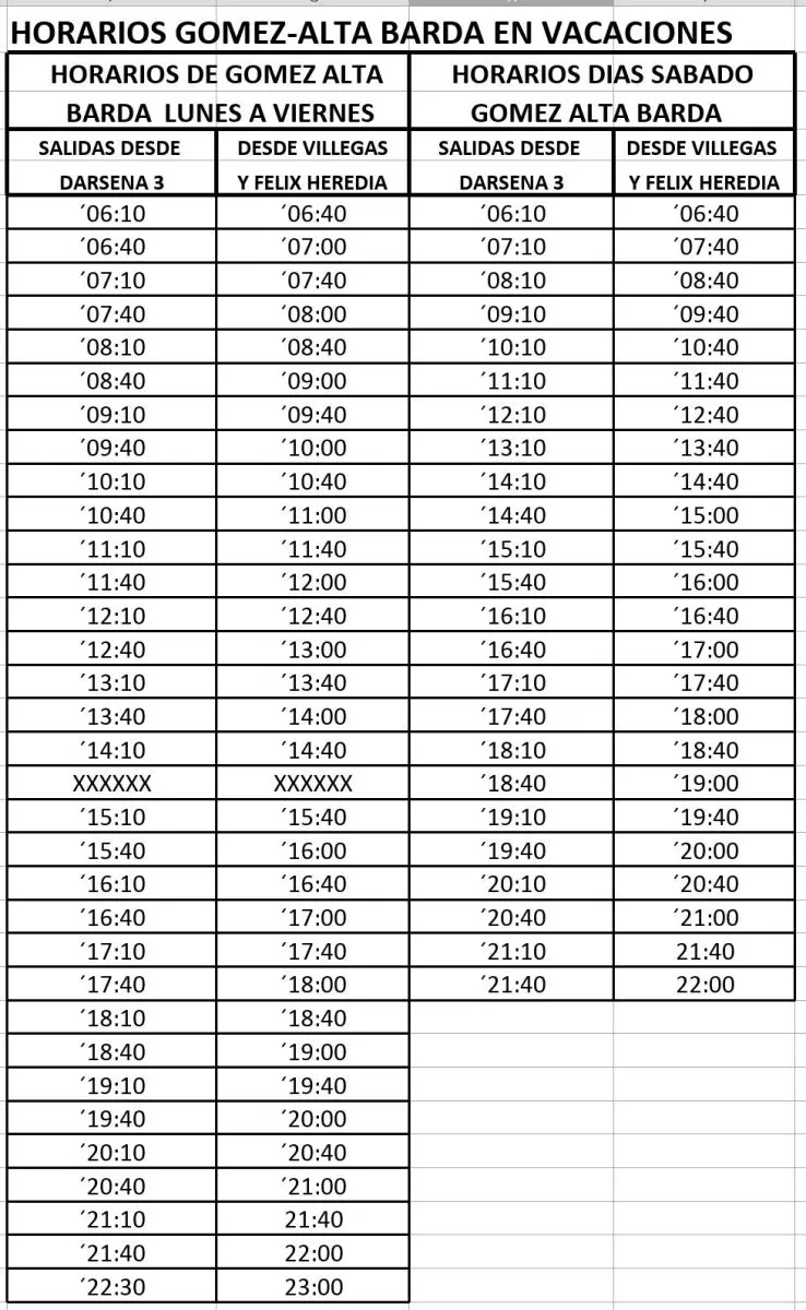 Durante las vacaciones los horarios del servicio son los siguiente:
