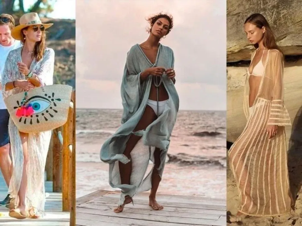 * Kimonos nocturnos: Animate a usar versiones con bordados, brillo o detalles más elegantes. Estos diseños, pensados para eventos de noche, se pueden usar perfectamente sobre la arena.