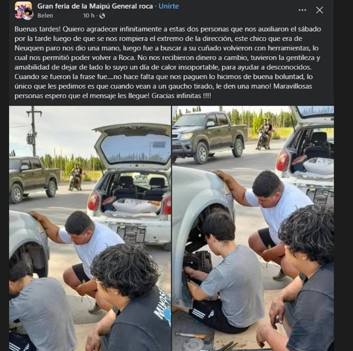 Según publicó la mujer en redes sociales, el joven que la ayudó es de Neuquén y no dudó un segundo en acudir a ayudarlos, junto a su cuñado, cuando vio que el extremo de la dirección de su automóvil estaba averiado.  “Este chico que era de Neuquén, paro nos dio una mano, luego fue a buscar a su cuñado volvieron con herramientas, lo cual nos permitió poder volver a Roca”, explicó.