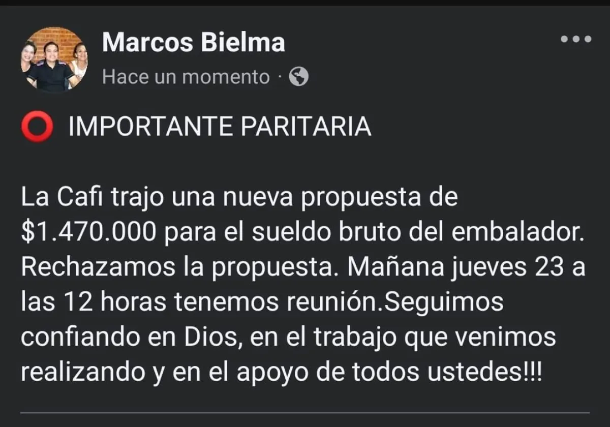 Marcos Bielma, titular del gremio, explicó: "La oferta no es acorde a la realidad económica ni a las expectativas de los trabajadores. Seguimos confiando en Dios, en el trabajo que venimos realizando y en el apoyo de todos ustedes". Mañana a las 12 se desarrollará una nueva instancia de diálogo.