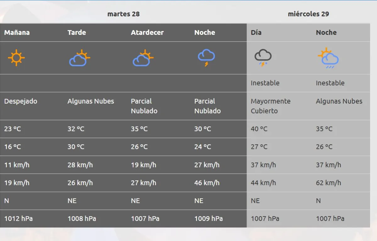 Para los próximos días habrá un ascenso de la temperatura, lo que provocara una ola de calor. El miércoles máxima de 40° C, aumento de la inestabilidad, probabilidad de tormentas eléctricas con chaparrones.