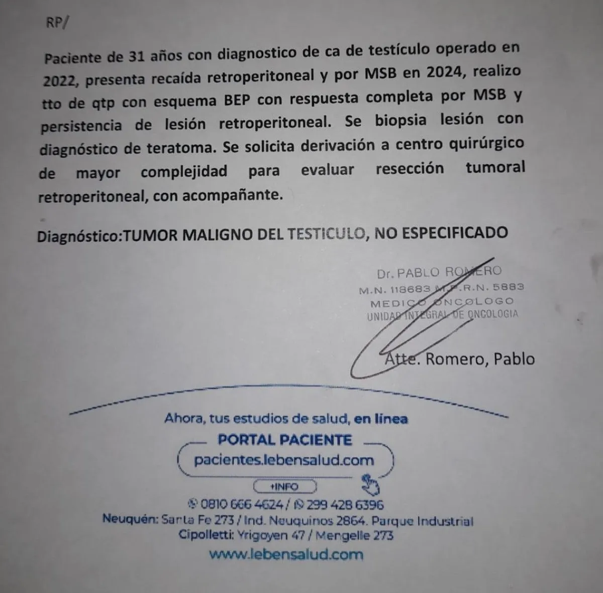 Lautaro Ezequiel Rozas tiene 31 años, vive en General Roca y trabaja en el servicio penitenciario. Su lucha contra el cáncer comenzó en 2022, cuando le detectaron un tumor testicular. Tras ser operado, nunca se le informó que el diagnóstico era cáncer. Sin esa información, Lautaro continuó con su vida hasta 2024, cuando empezó a sentir fuertes dolores en la ingle.