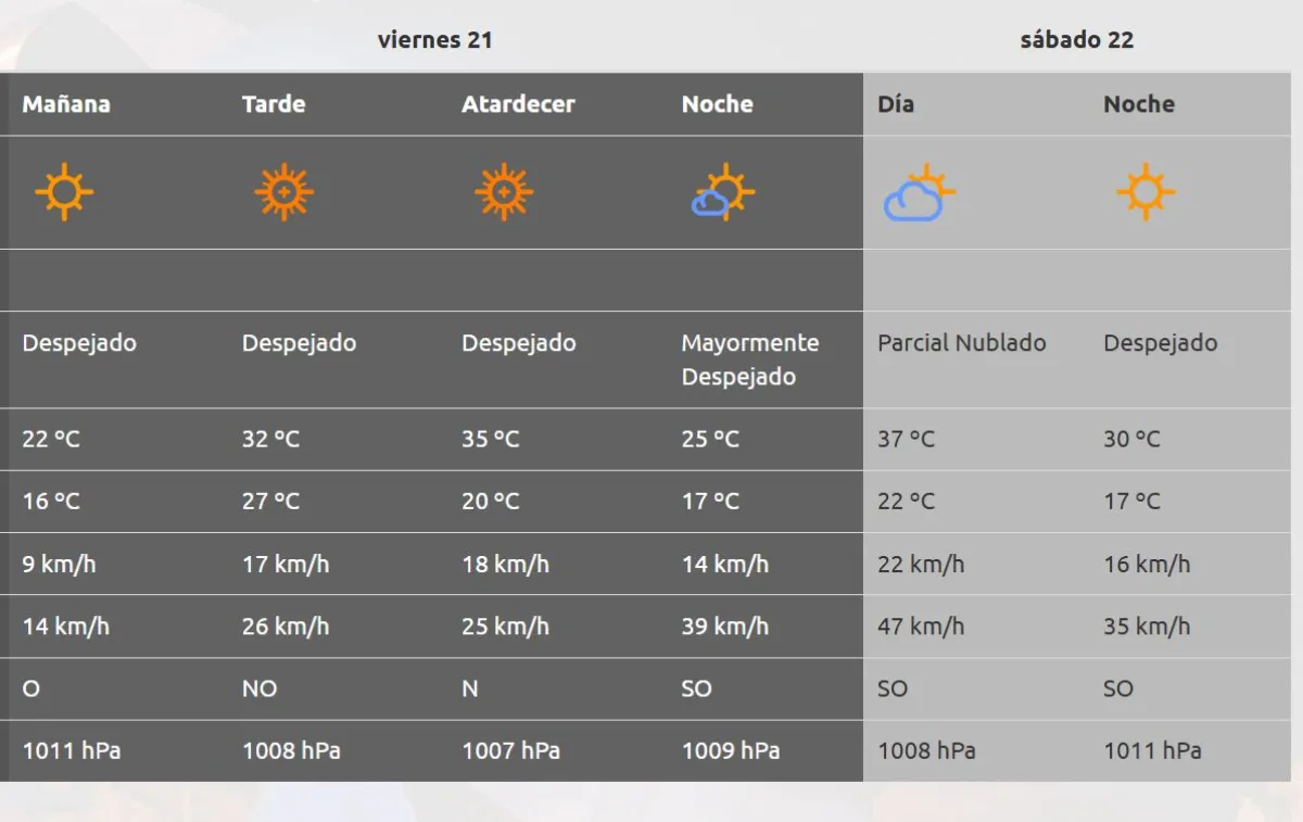 El sábado la temperatura subirá a 37° C con algunas nubes dispersas. Finalmente, el domingo, último día de la Fiesta, el tiempo se mantendrá mayormente despejado, con una máxima de 36° C y una suave brisa que ayudará a enfrentar el calor.