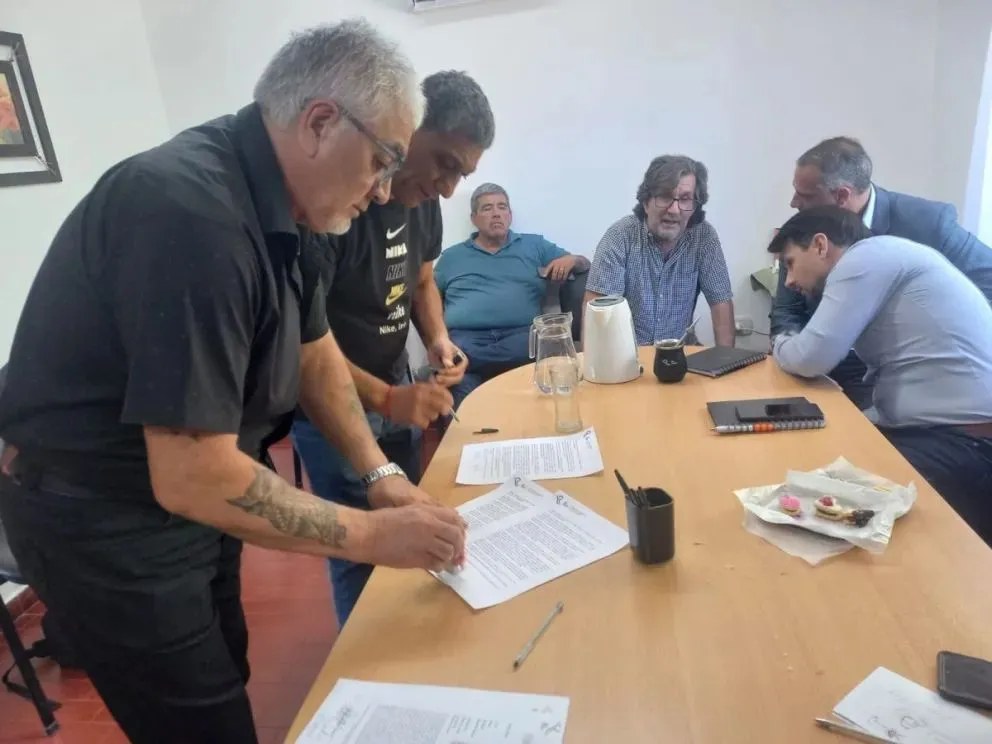El momento de la paz: el sindicato y las empresas firmaron el acuerdo y 40 trabajadores de la región ingresarán a la obra. Foto: gentileza.